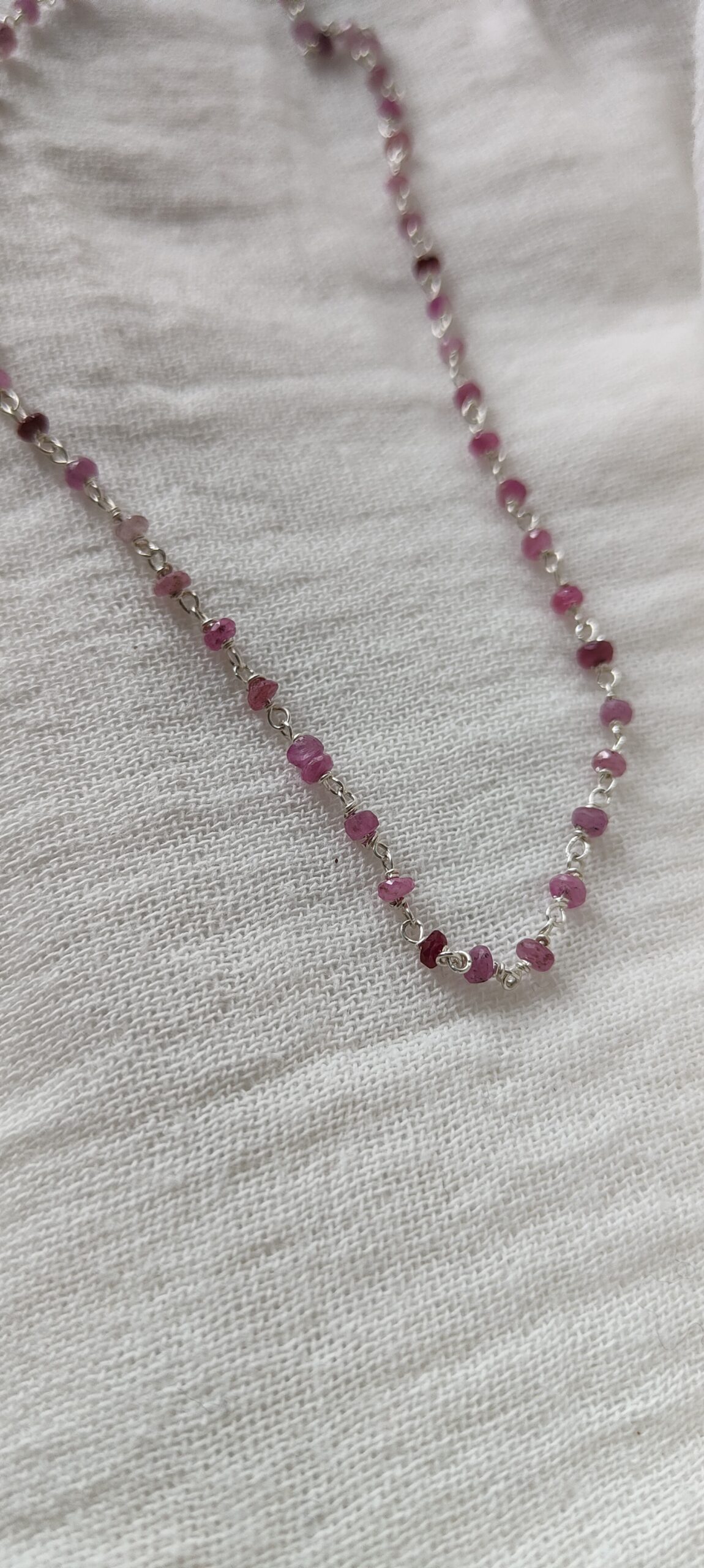 Girocollo di zaffiri rosa e radice di rubino, leggero. Dona luce in modo semplice e raffinato.